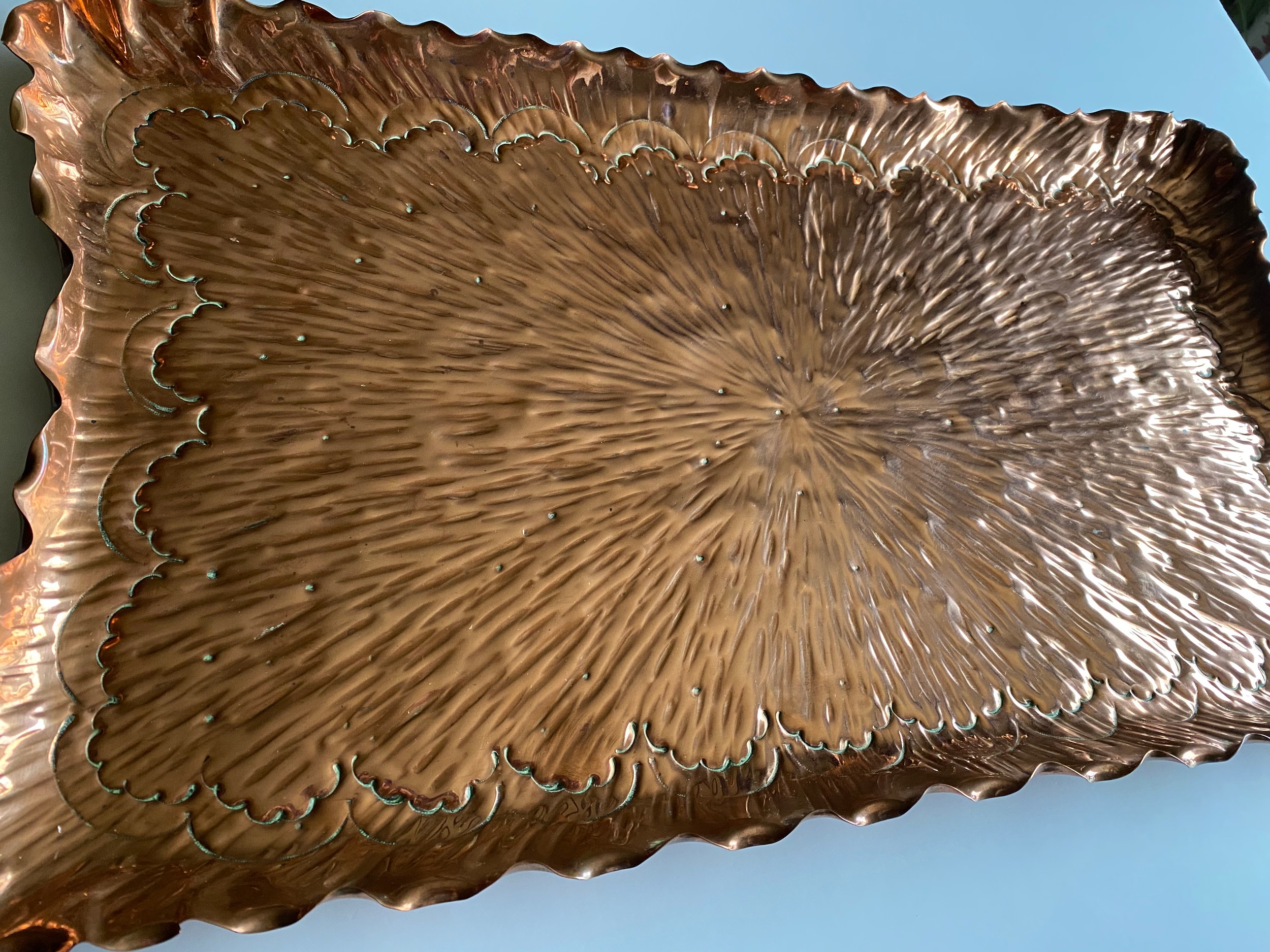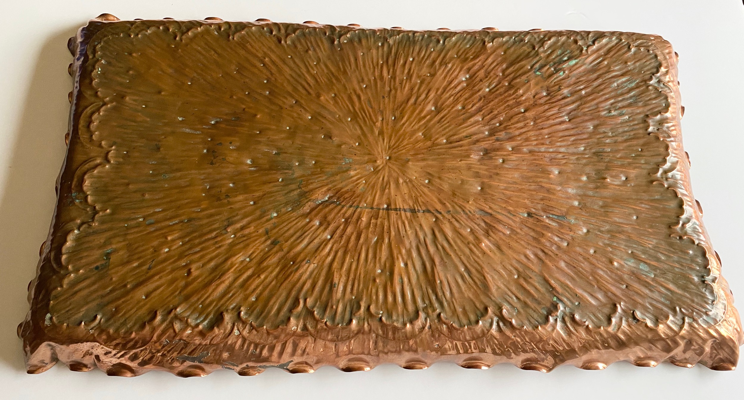 Large rectangular decorative copper tray, arts and crafts design with fluted rim, approx L58 x 33cm